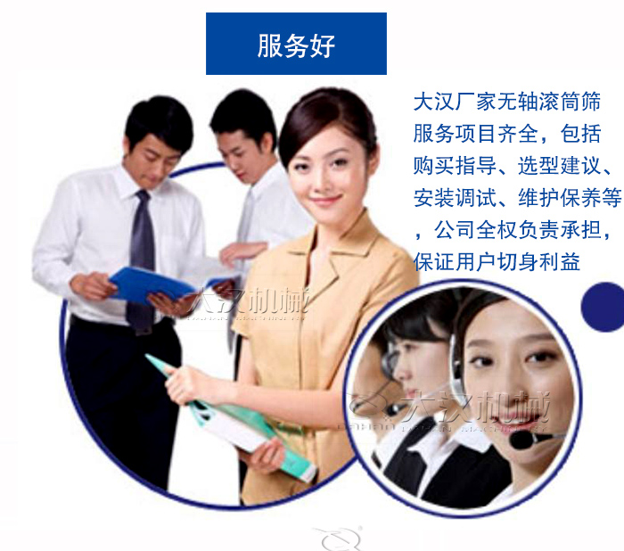 大漢廠家無軸滾筒篩服務(wù)項目齊全,包括購買指導(dǎo)、選型建議、安裝調(diào)試、維護(hù)保養(yǎng)等,公司全權(quán)負(fù)責(zé)承擔(dān),保證用戶切身利益。