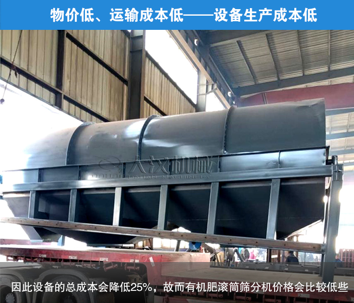 大漢公司位于新鄉大漢,設備的運輸非常方便快捷、省時省力,免除了40%以上的成本費用,且新鄉人力、物力資源豐富,生產設備花費的制造成本也相對減少10%左右,因此設備的總成本會降低25%,故而有機肥滾筒篩分機價格會比較低些。