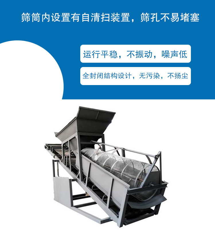 2、篩筒內(nèi)設(shè)置有自清掃裝置,篩孔不易堵塞。