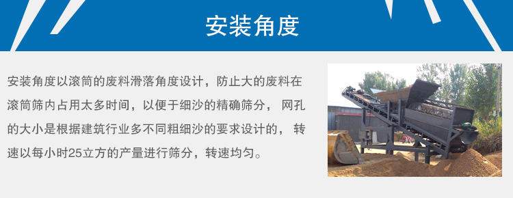 安裝角度以滾筒的廢料滑落角度設(shè)計(jì),防止大的廢料在滾筒篩內(nèi)占用太多時(shí)間,以便于細(xì)沙的篩分, 網(wǎng)孔的大小是根據(jù)建筑行業(yè)多不同粗細(xì)沙的要求設(shè)計(jì)的, 轉(zhuǎn)速以每小時(shí)25立方的產(chǎn)量進(jìn)行篩分,轉(zhuǎn)速均勻。