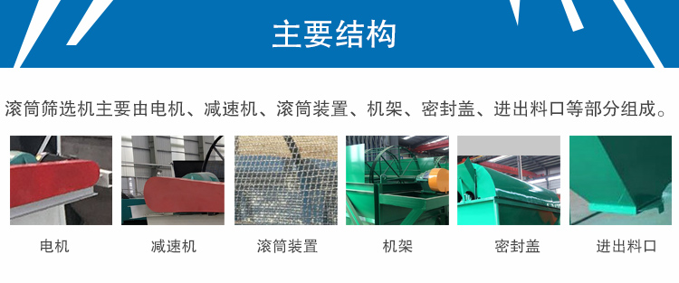滾筒篩選機(jī)主要由電機(jī)、減速機(jī)、滾筒裝置、機(jī)架、密封蓋、進(jìn)出料口等部分組成。滾筒裝置傾斜安裝在機(jī)架上,電機(jī)經(jīng)減速機(jī)與滾筒裝置通過連軸器連接在一起,驅(qū)動滾筒裝置繞其軸線運動。