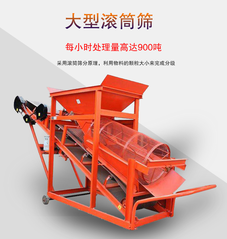 大型滾筒篩又叫大型滾筒篩沙機,是指針對產量較大的用戶選擇的型號,采用滾筒篩分原理,利用物料的顆粒大小來完成分級,克服了圓振動篩和直線篩在篩分較濕物料時出現的篩網堵塞問題,提高了篩分效率。