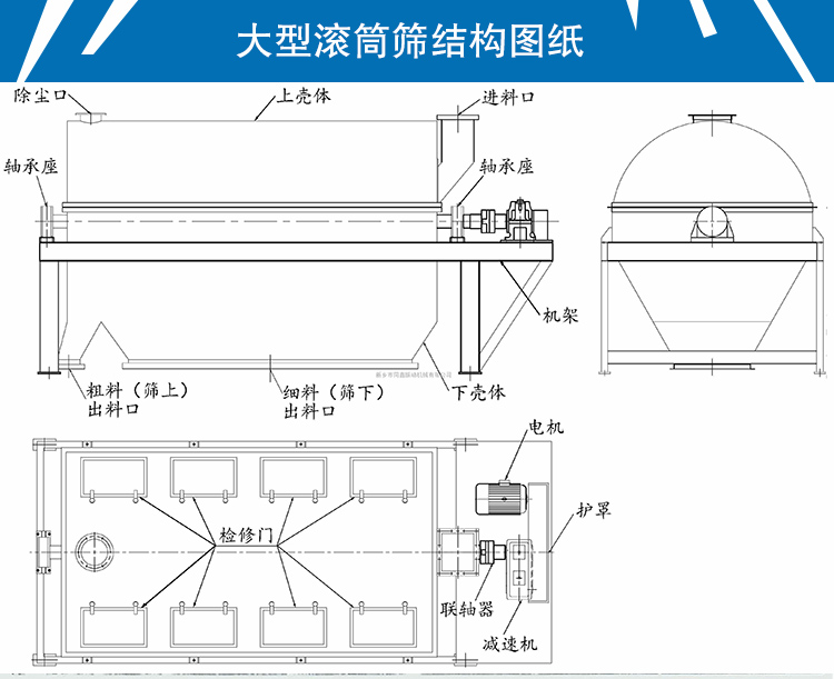 大型滾筒篩主要有電機、減速機、滾筒裝置、機架、密封蓋、進出料口組成。滾筒裝置傾斜安裝于機架上。電動機經減速機與滾筒裝置通過聯軸器連接在一起,驅動滾筒裝置繞其軸線轉動。