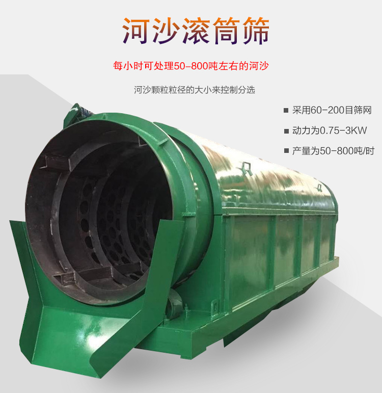 河沙滾筒篩是專門用來對河道中河沙進行分選的設備,是通過河沙顆粒粒徑的大小來控制分選的,采用60-200目篩網,動力為0.75-3KW,產量為50-800噸/時,根據不同用戶的實際情況定制各種規格。