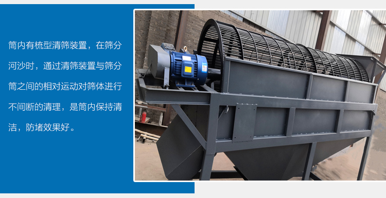 2、筒內有梳型清篩裝置,在篩分河沙時,通過清篩裝置與篩分筒之間的相對運動對篩體進行不間斷的清理,是筒內保持清潔,防堵效果好。