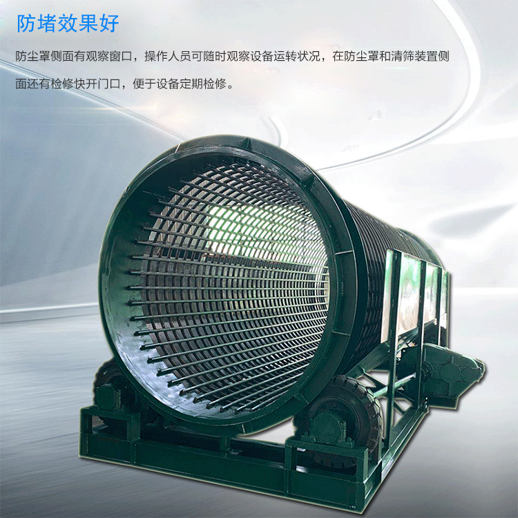 5、防塵罩側面有觀察窗口,操作人員可隨時觀察設備運轉狀況,在防塵罩和清篩裝置側面還有檢修快開門口,便于設備定期檢修。