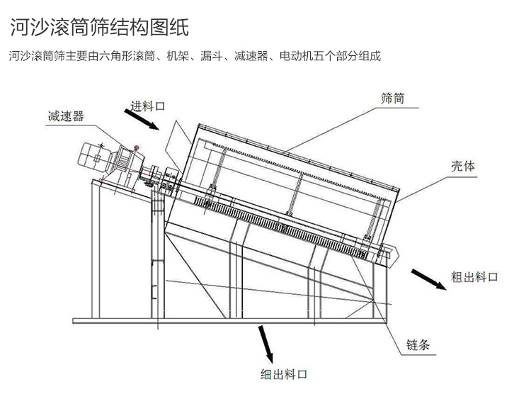 河沙滾筒篩主要由六角形滾筒、機架、漏斗、減速器、電動機五個部分組成的。