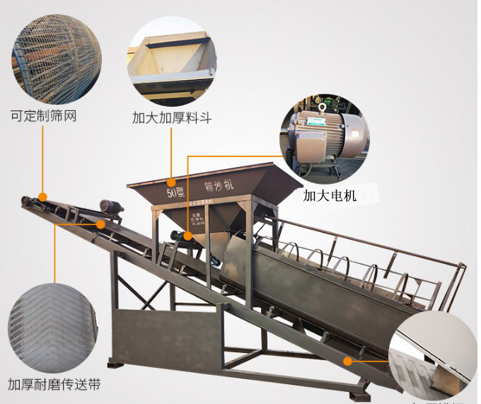 整個設備有原料儲料倉、原料供料皮帶機、平置篩網、成品砂堆料皮帶、棄石出料槽等組成。
