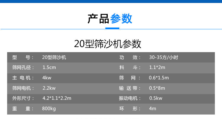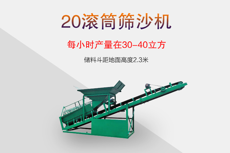20滾筒篩沙機屬于較小型號的一種篩沙機設備,其外形尺寸為4.2*1.1*2.3米,滾筒直徑為1.5*0.6米。儲料斗距地面高度2.3米,每小時產量在30-40立方。
