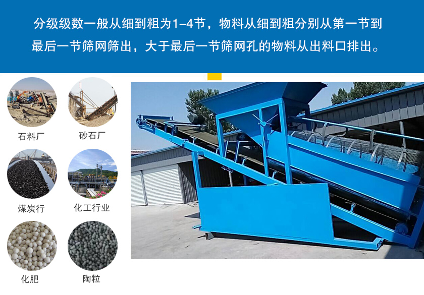 圓筒回轉篩根據不同分級要求,其分級級數一般從細到粗為1-4節,物料從細到粗分別從第一節到最后一節篩網篩出,大于最后一節篩網孔的物料從出料口排出。